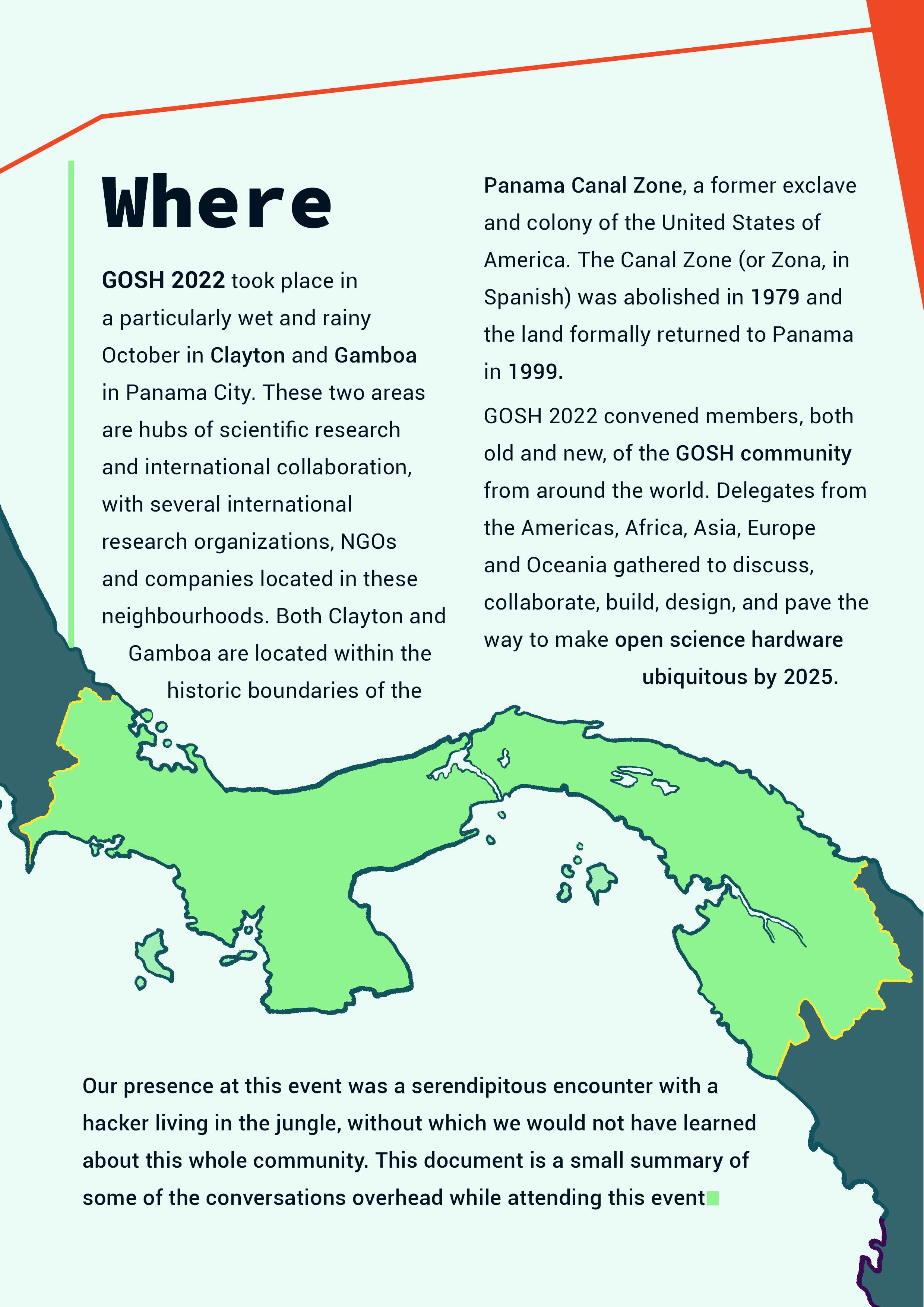 GOSH 2022 took place in a particularly wet and rainy October in the neighbourhoods of Clayton and Gamboa in Panama City, Panama. These two places are hubs of scientific research and international collaboration, with several international research organizations, NGOs and companies located in these neighbourhoods. Both Clayton and Gamboa are located within the historic boundaries of the Panama Canal Zone, a former exclave and colony of the United States of America. The Canal Zone (or Zona, in Spanish) was abolished in 1979 and the land formally returned to Panama in 1999.